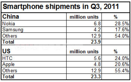 據(jù)Strategy Analytics報道,今年第三季度中國的智能手機出貨量約為2400萬臺,環(huán)比增長58%,遠遠超越此前位于榜首的美國。另外,在第三季度中國智能手機市場,諾基亞智能機的銷量仍然位居第一,三星則居于第二,而這兩家智能手機的市場占有率之和已接近50%。